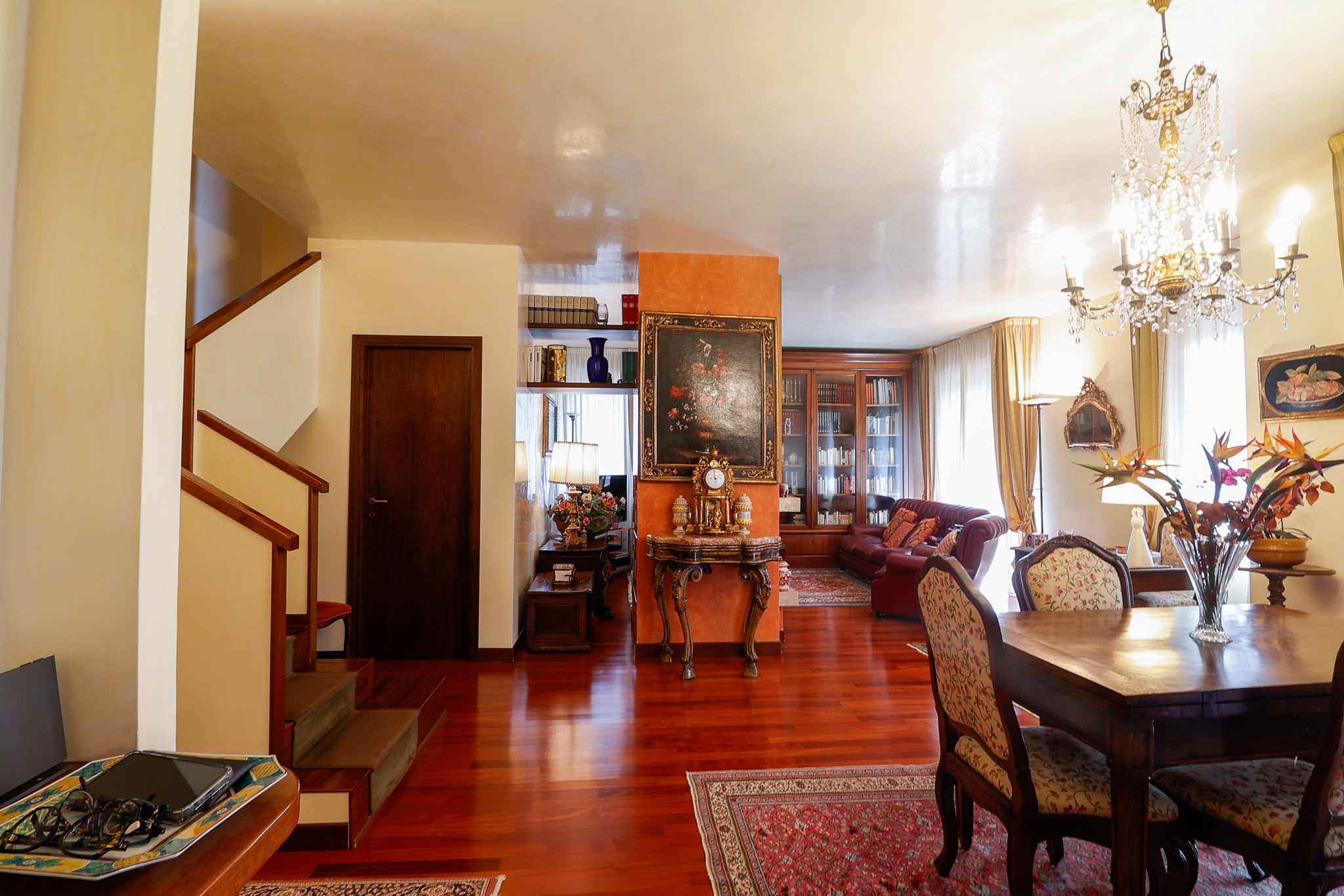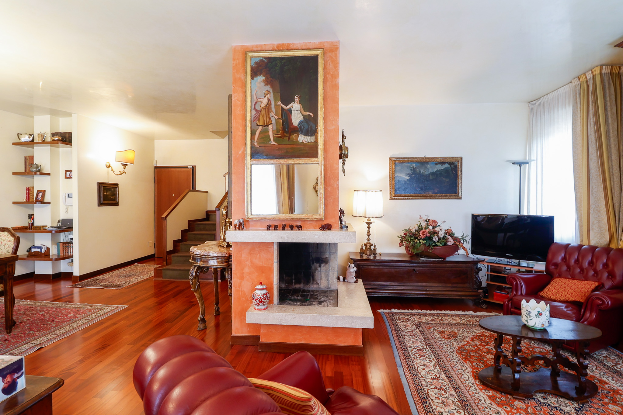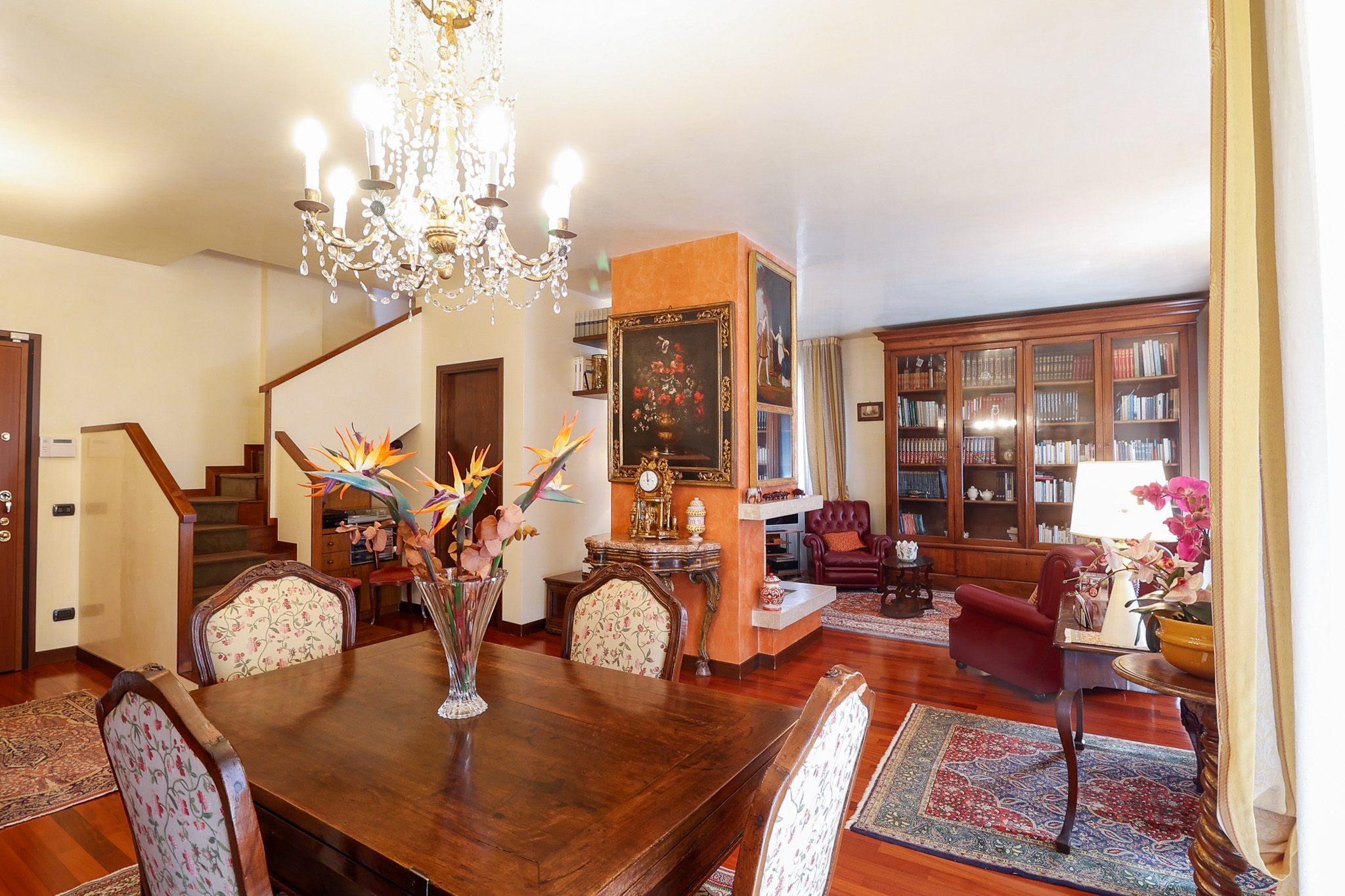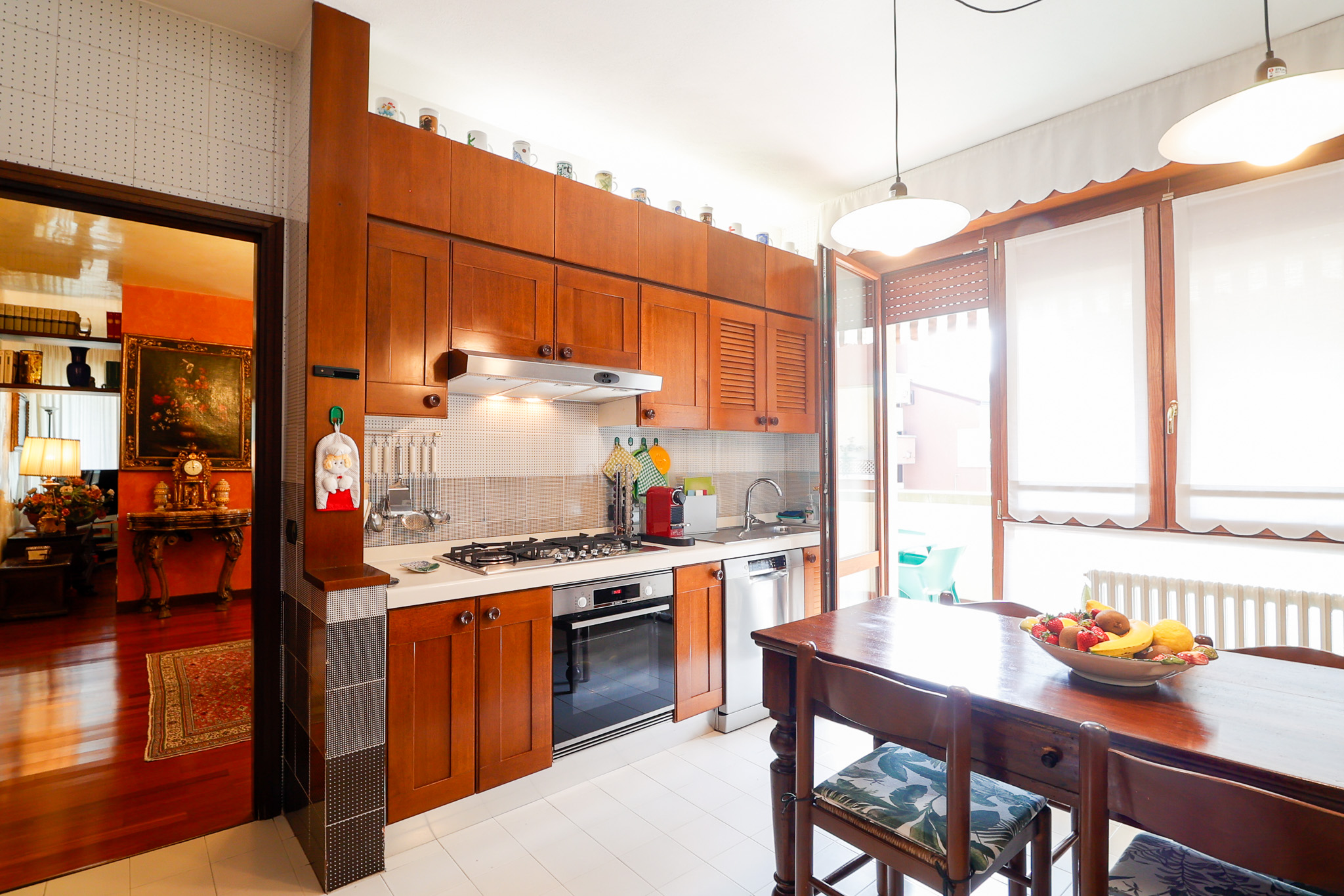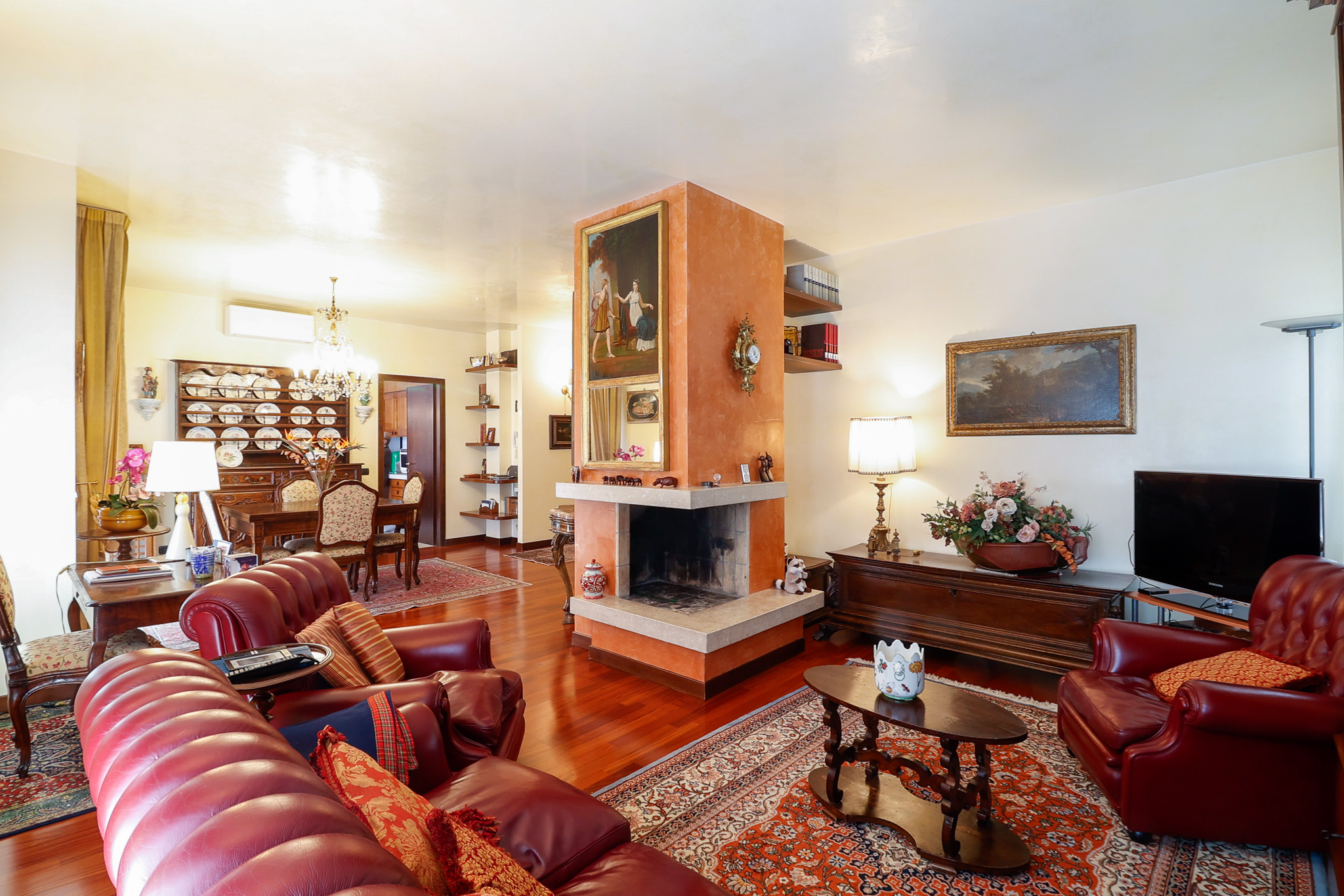 L’ingresso conduce a una scenografica zona giorno, caratterizzata da un camino centrale che separa con eleganza l’area pranzo dal salotto, creando un ambiente accogliente e ben definito. Da qui si accede al primo balcone. La cucina, ampia e abitabile, è separata e gode di accesso diretto a un secondo balcone, perfetto per la quotidianità. Completa il piano un pratico ripostiglio e un bagno di generose dimensioni.