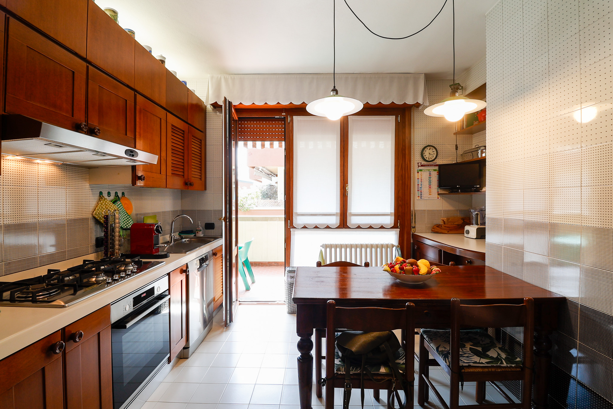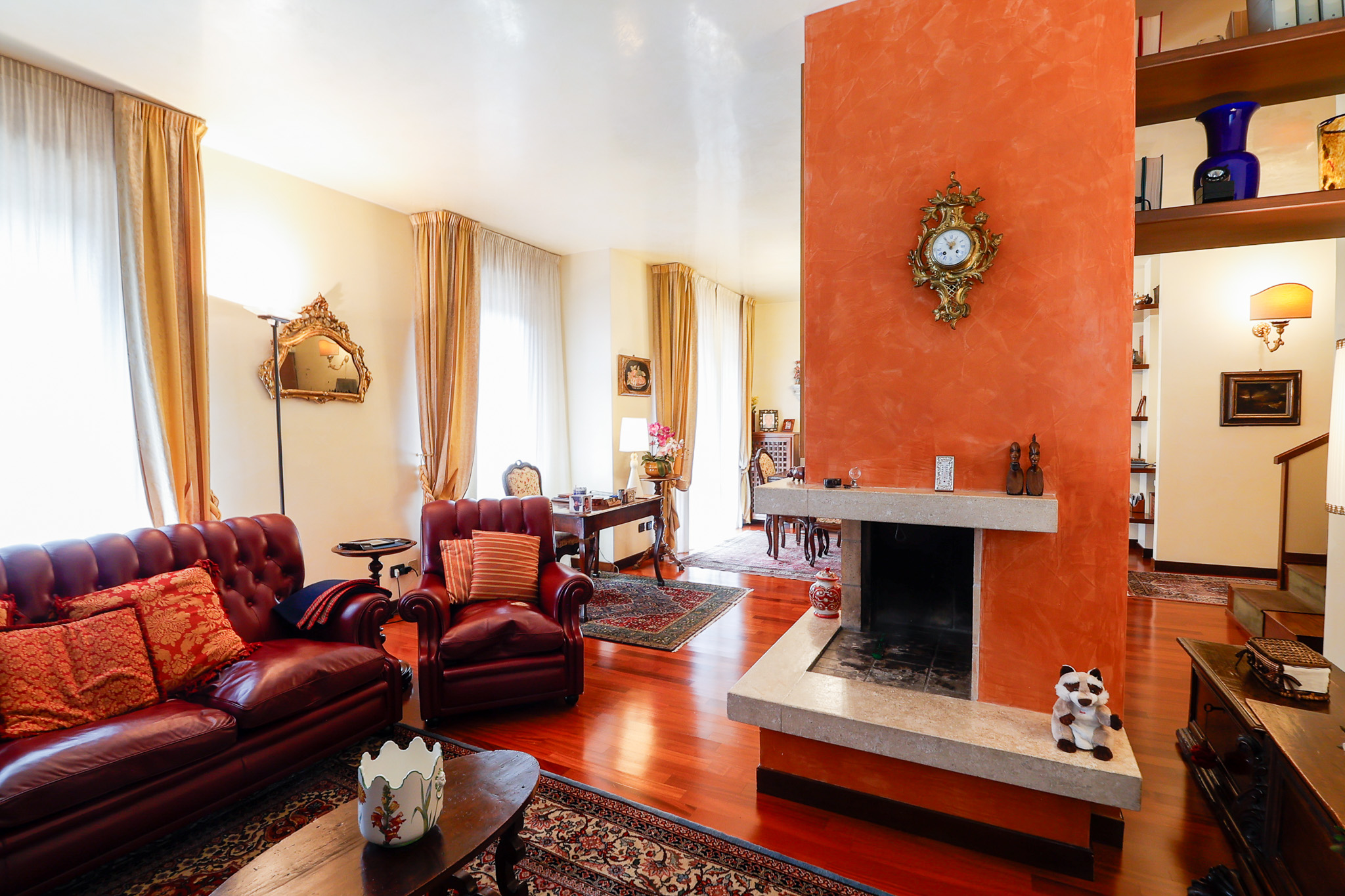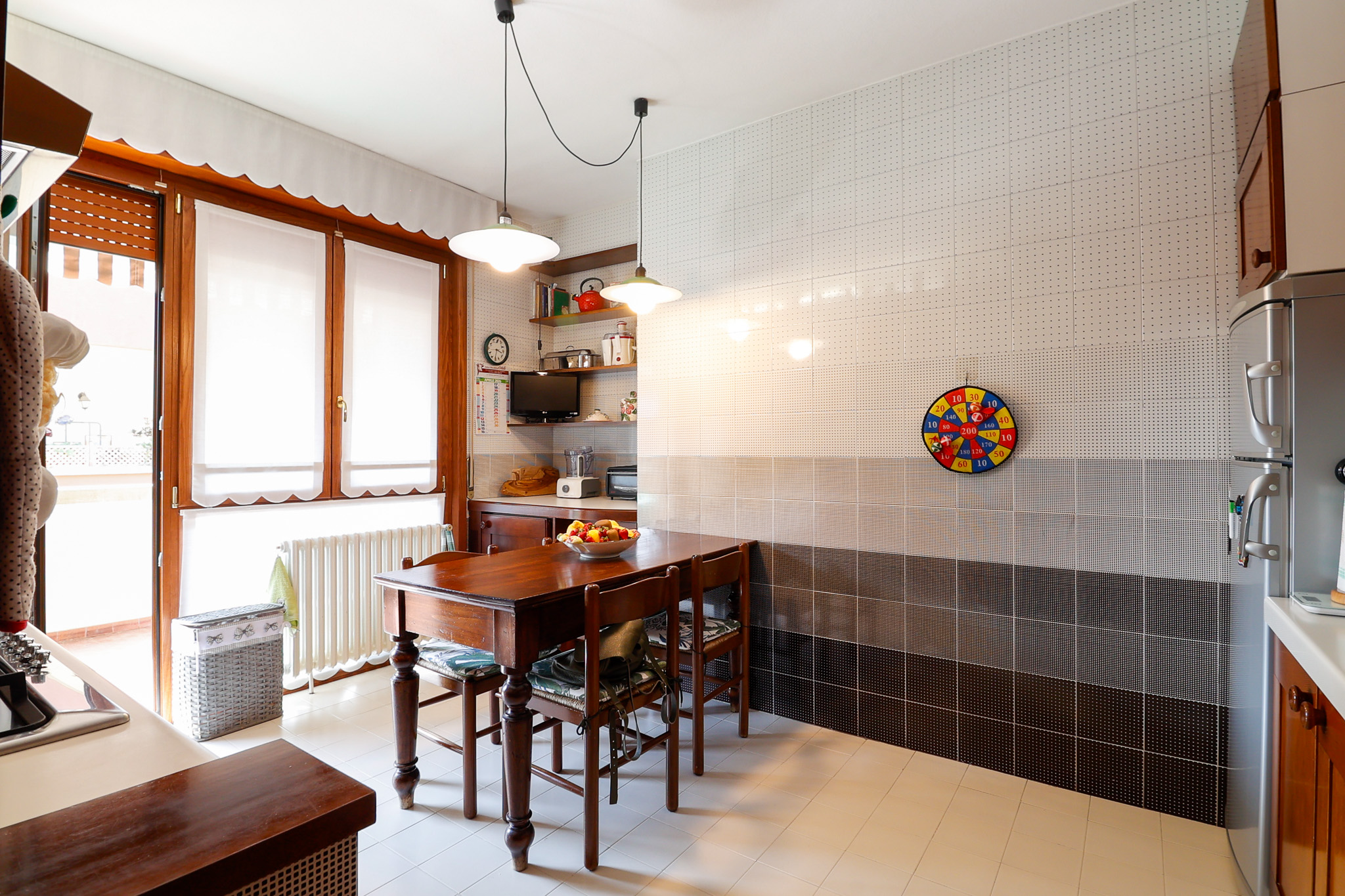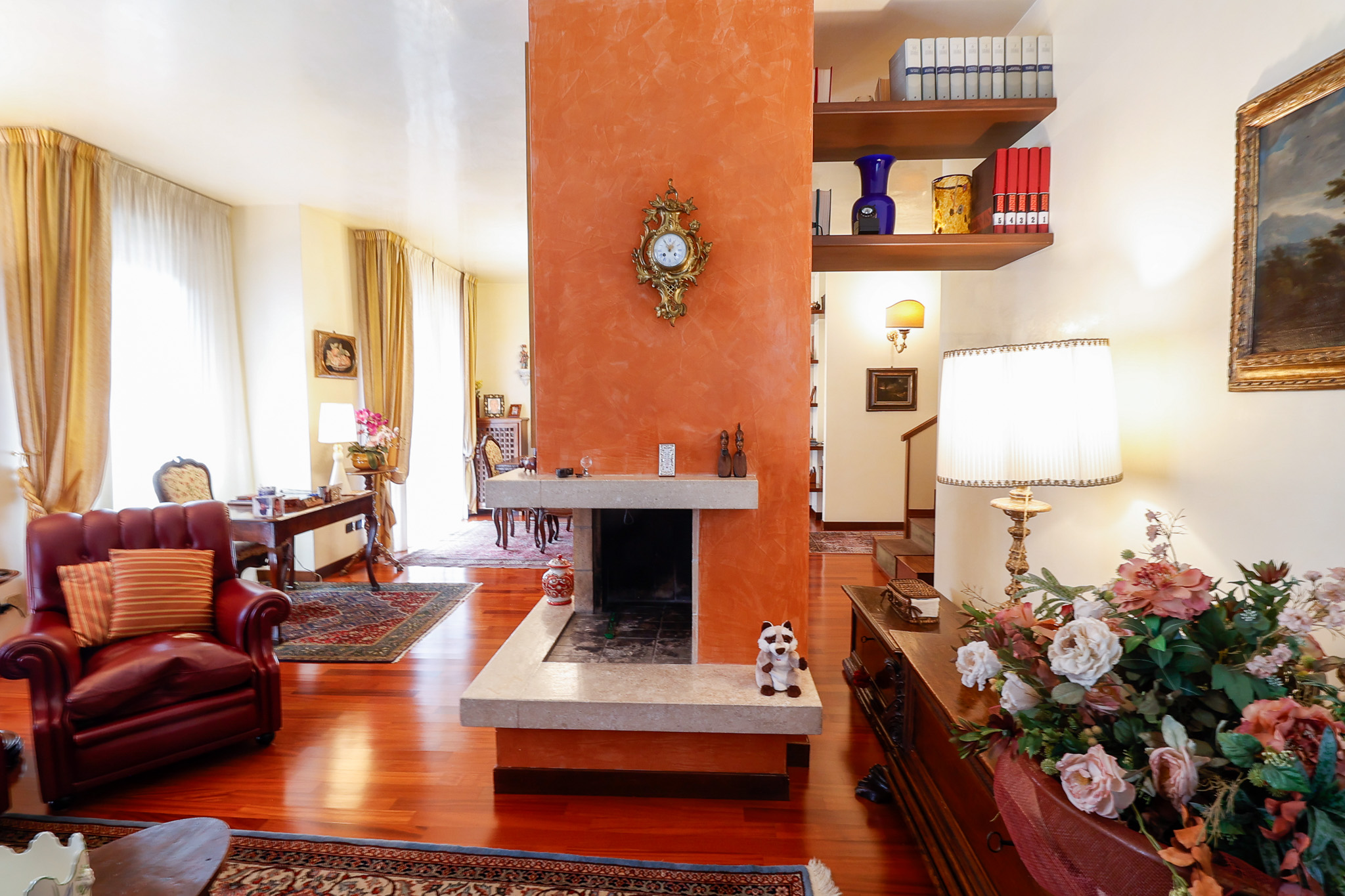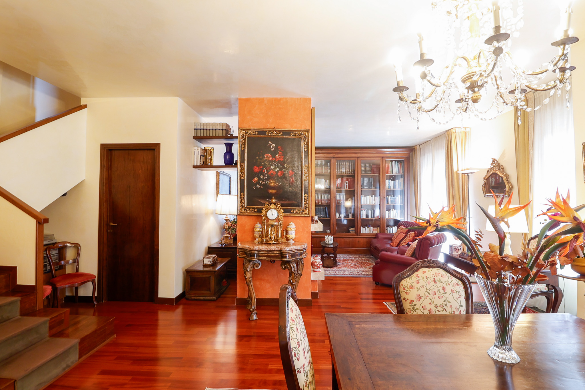 L’ingresso conduce a una scenografica zona giorno, caratterizzata da un camino centrale che separa con eleganza l’area pranzo dal salotto, creando un ambiente accogliente e ben definito. Da qui si accede al primo balcone. La cucina, ampia e abitabile, è separata e gode di accesso diretto a un secondo balcone, perfetto per la quotidianità. Completa il piano un pratico ripostiglio e un bagno di generose dimensioni.