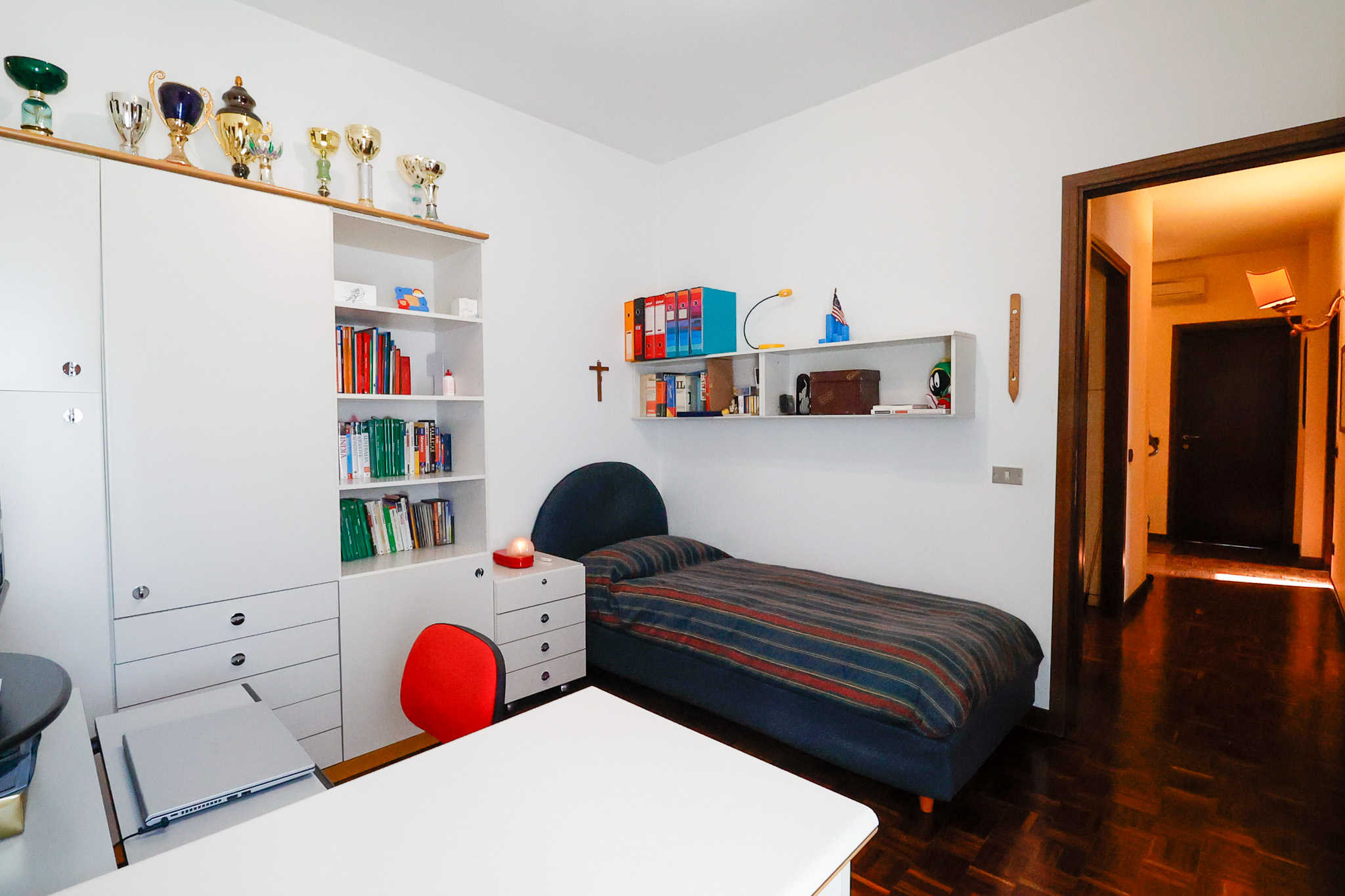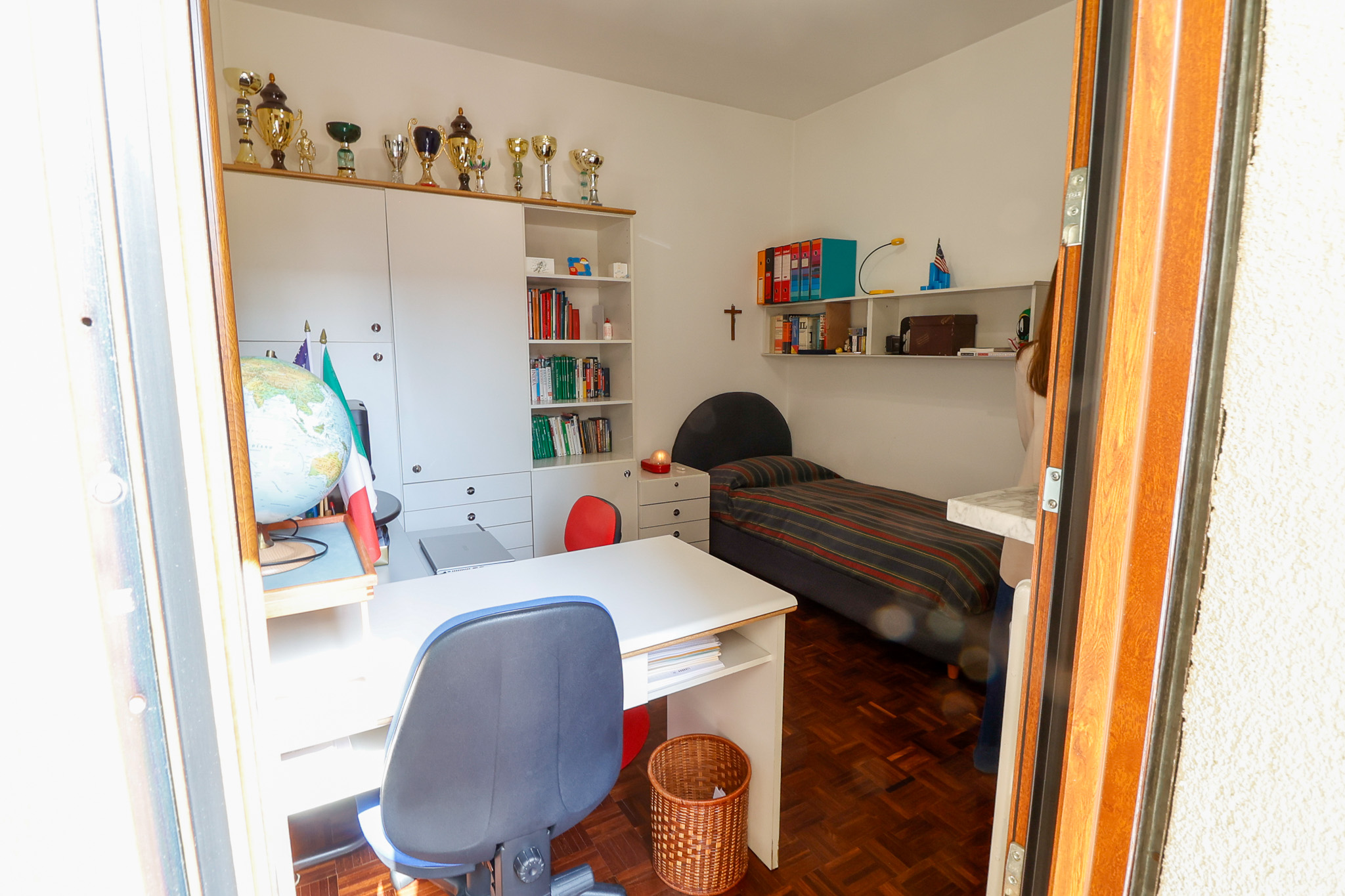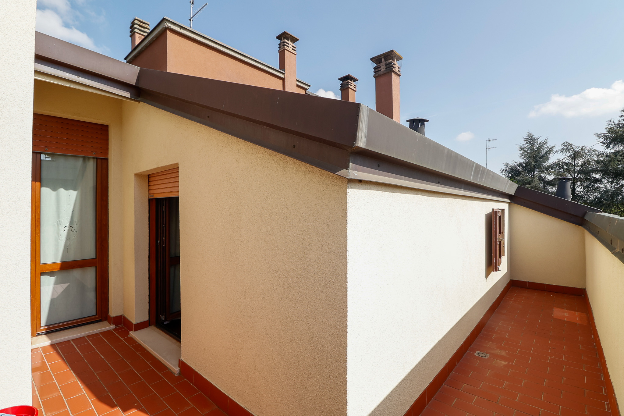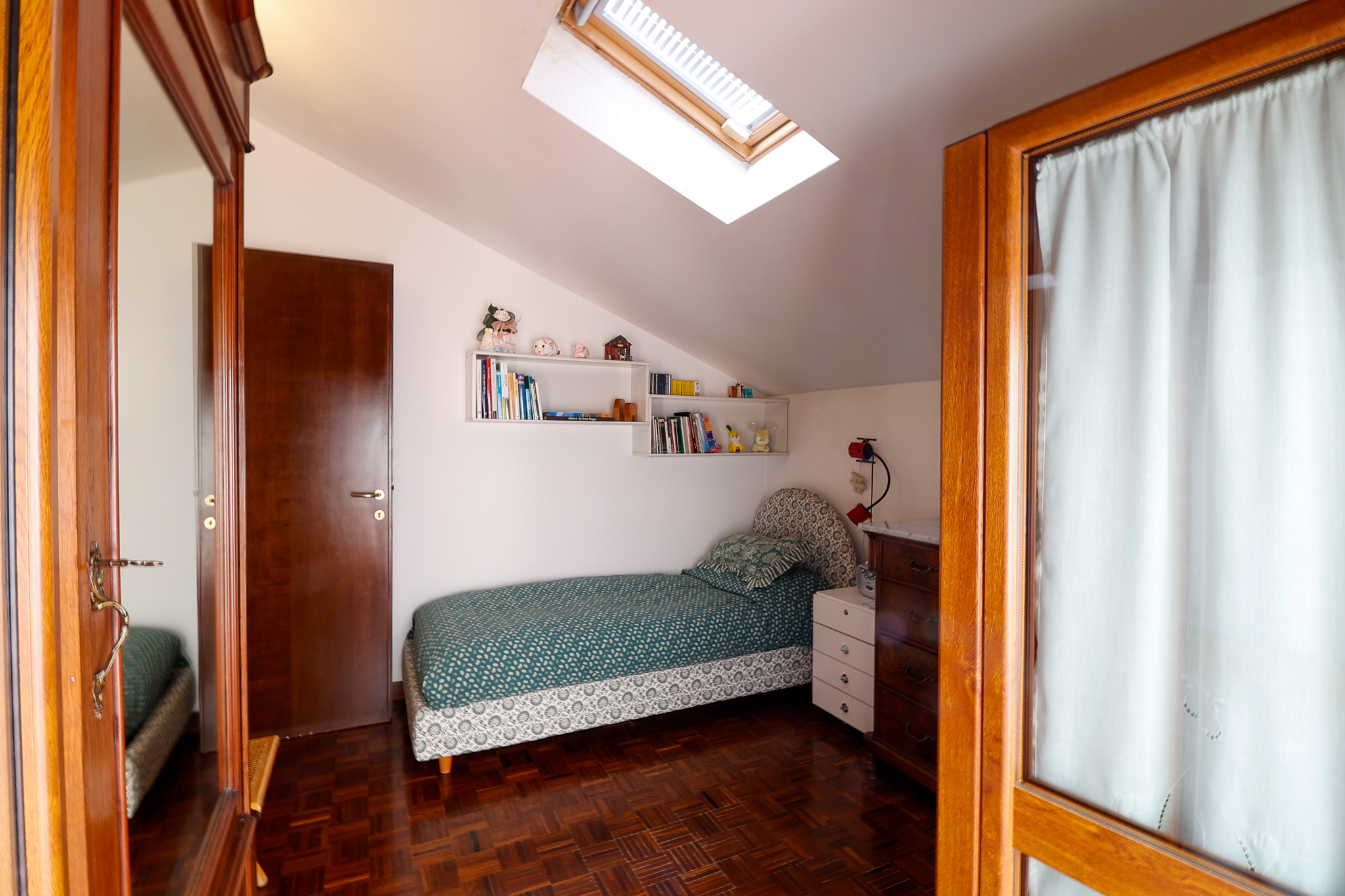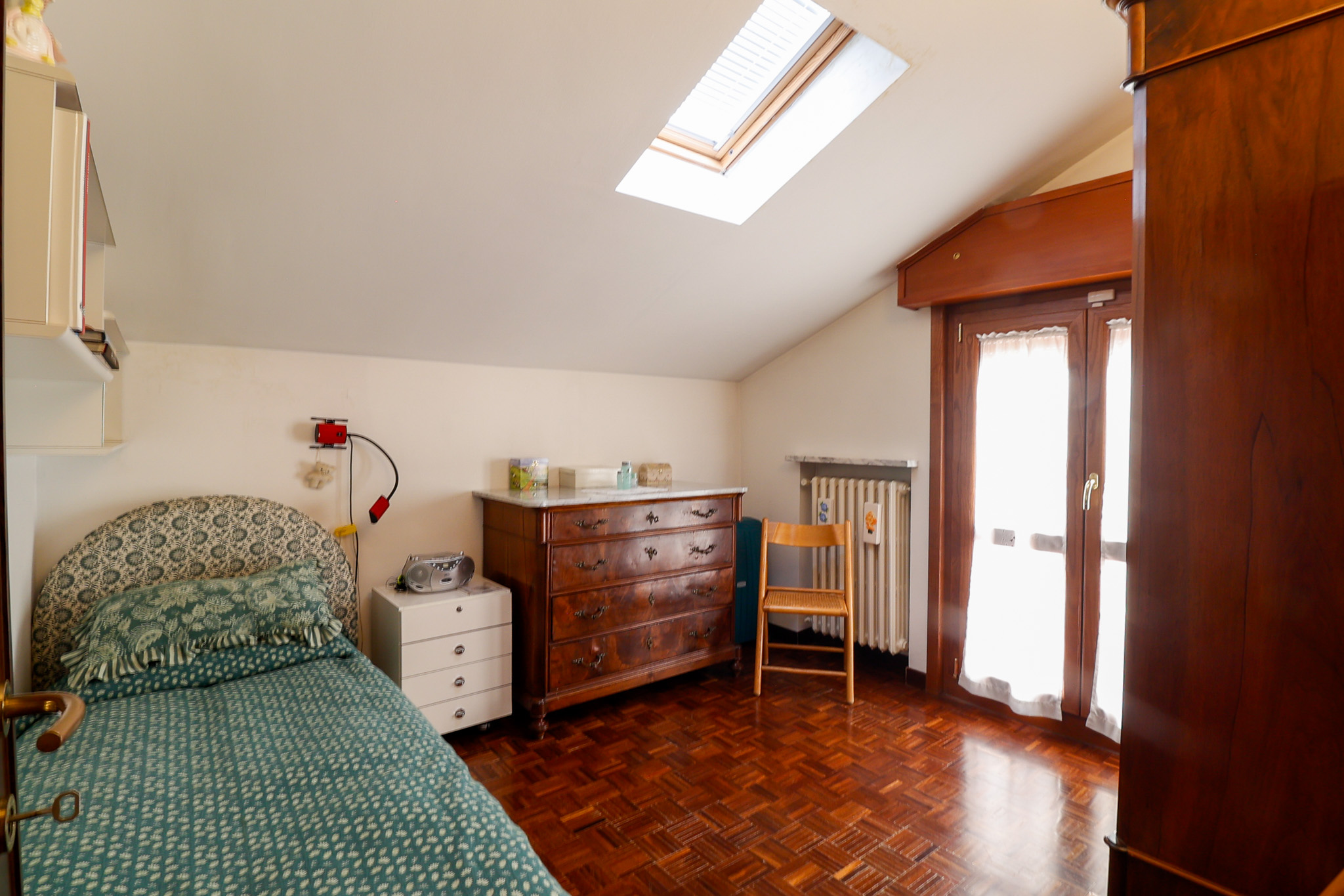 Salendo al livello superiore si sviluppa la zona notte: la camera matrimoniale dispone di bagno en suite e cabina armadio, mentre le due camere singole sono ben proporzionate e servite da un ulteriore bagno. Tutte le stanze hanno accesso a caratteristici balconi a tasca, che aggiungono ulteriore luce e respiro agli ambienti. Un valore aggiunto importante è il secondo ingresso indipendente dal vano condominiale, che rende i due piani eventualmente separabili, offrendo così una grande flessibilità d’uso.