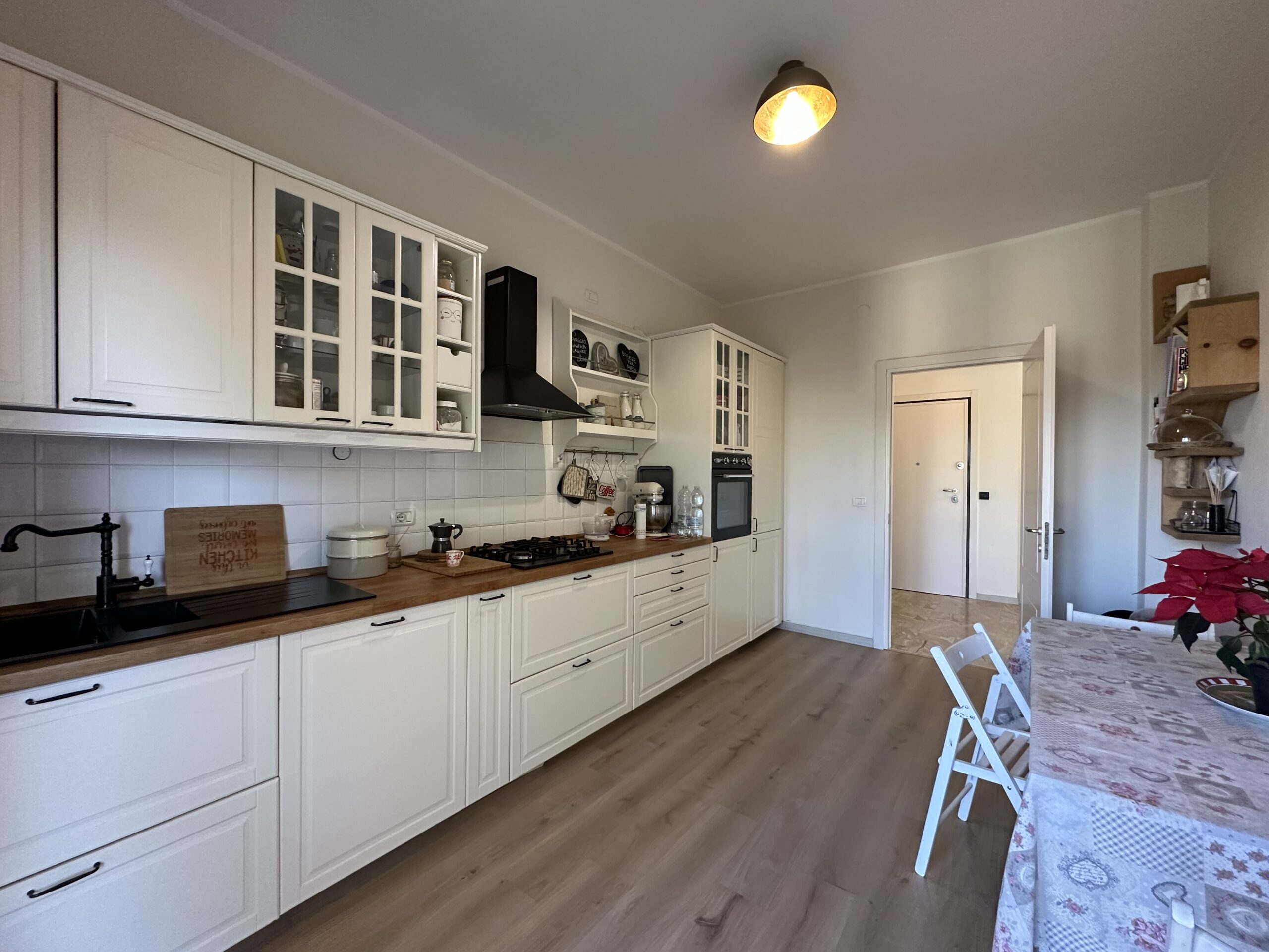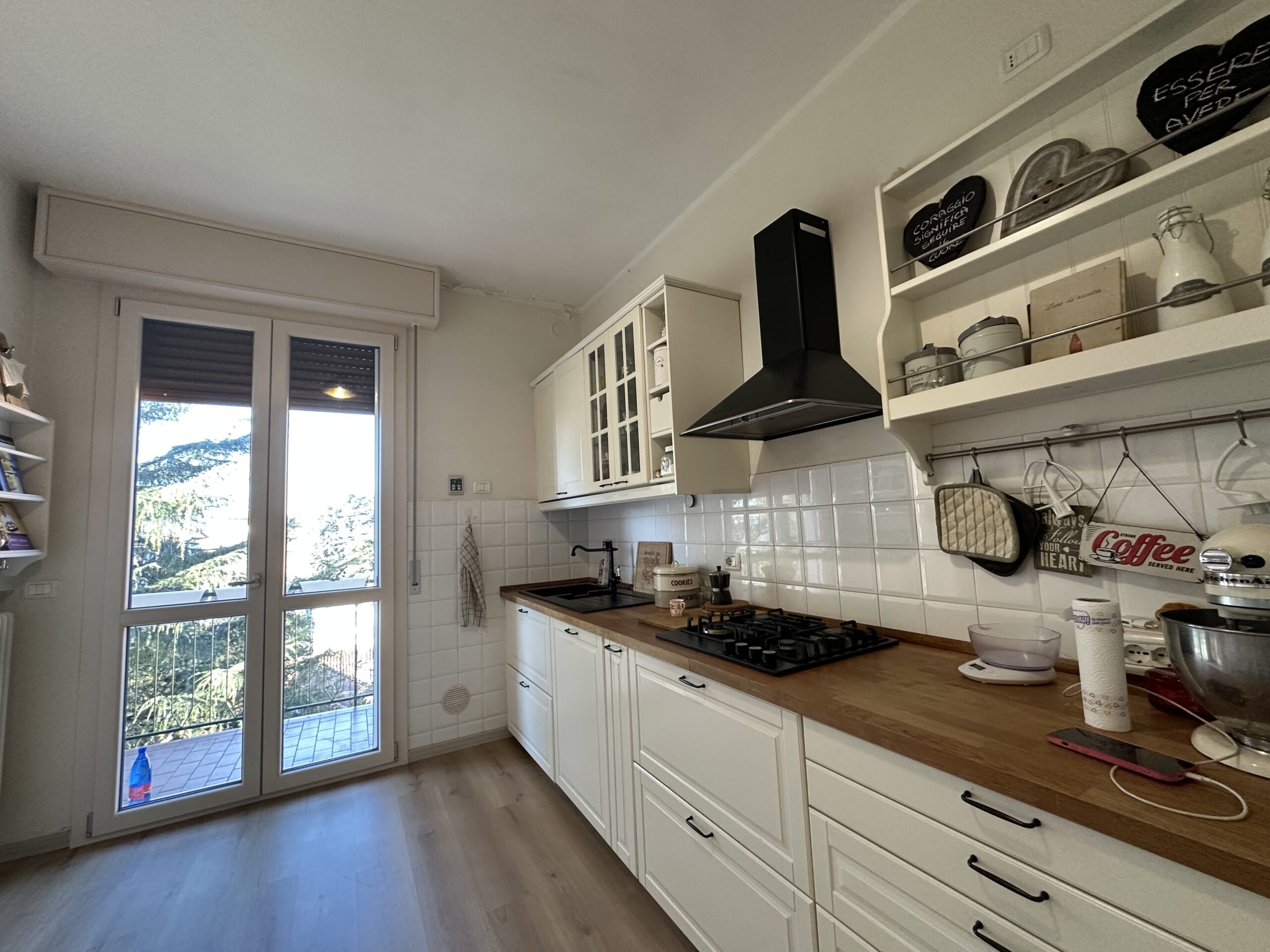 L’ingresso accompagna a un ampio soggiorno con accesso diretto a una loggia vivibile e dalla quale si gode una bellissima vista aperta con suggestivi tramonti. La cucina è abitabile e anch’essa con accesso alla stessa loggia, creando un collegamento armonioso tra gli spazi della zona giorno.