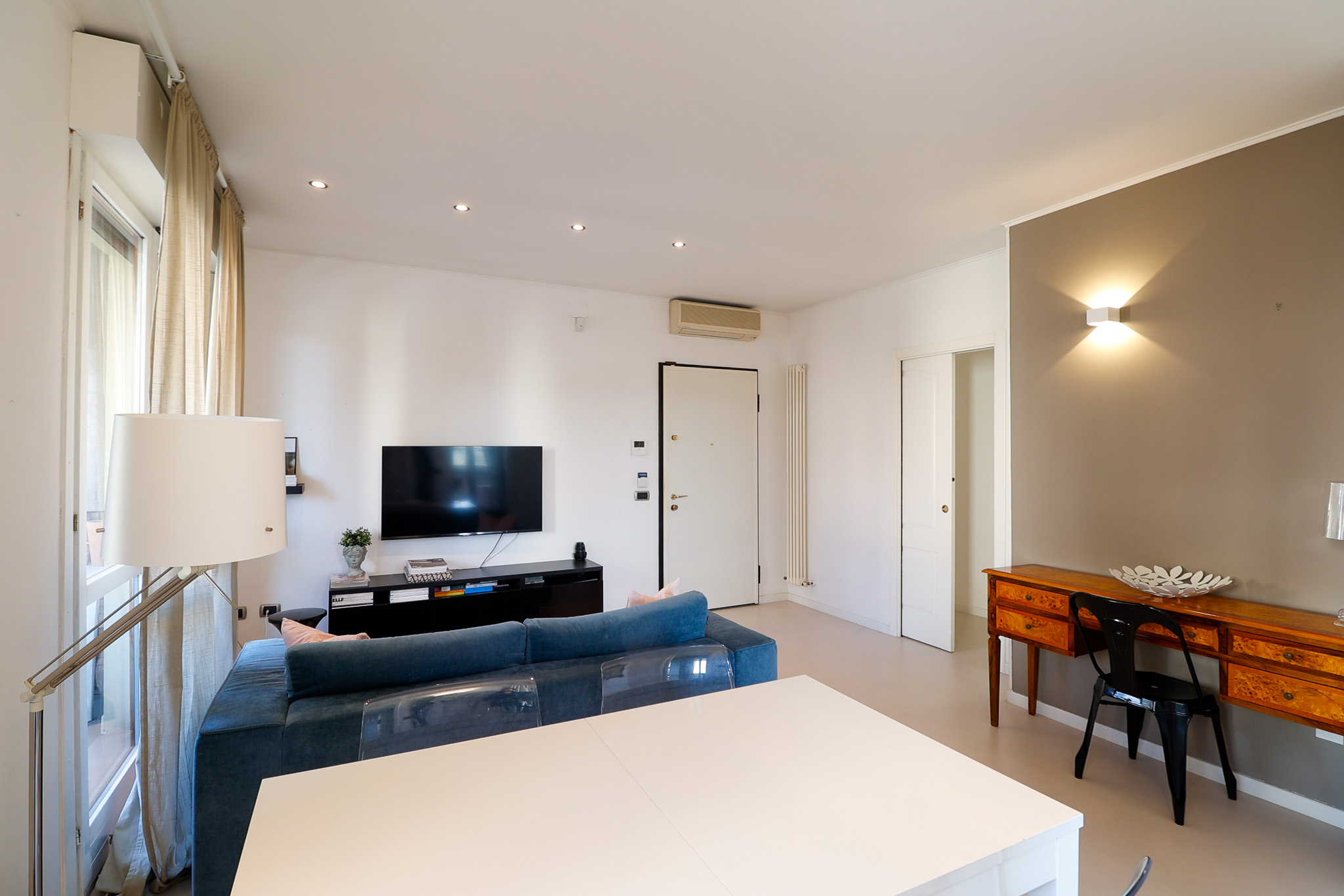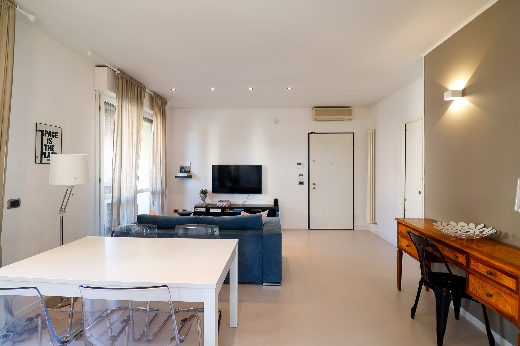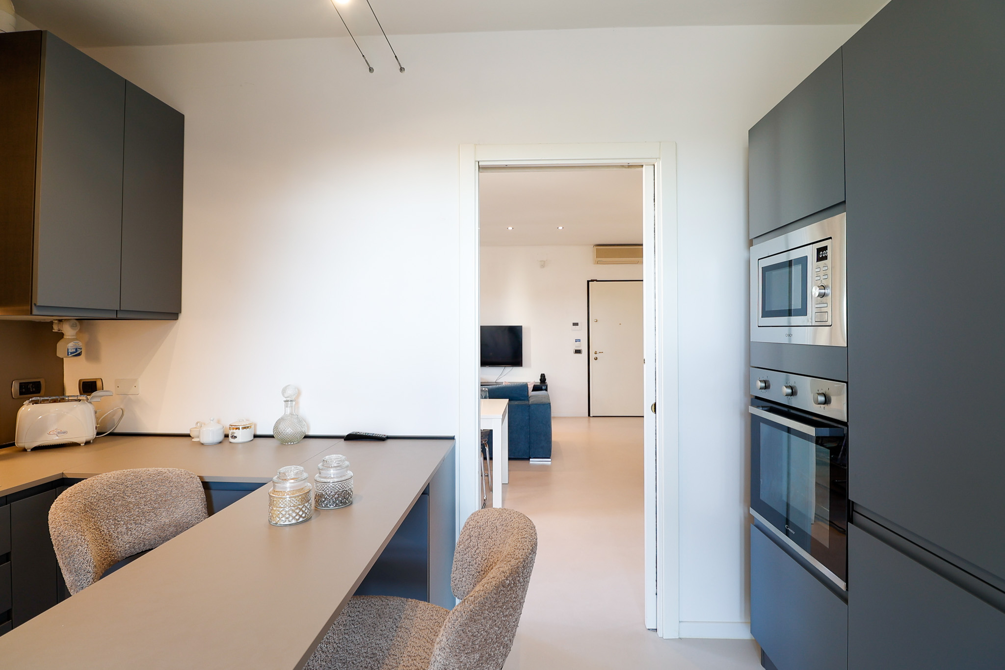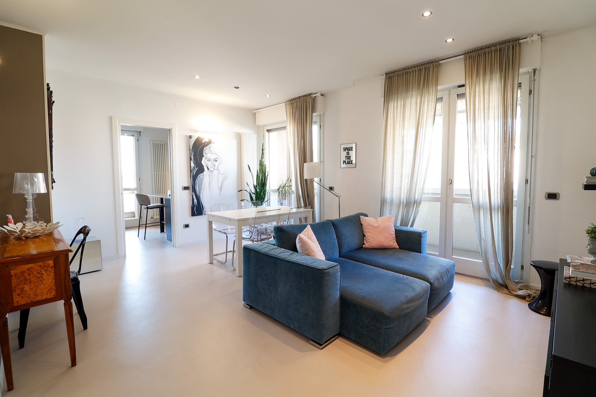 L’ingresso si apre su una zona living ampia e ariosa, caratterizzata dal pavimento in resina e da porte finestre che collegano direttamente al balcone, creando continuità tra interno ed esterno e una piacevole sensazione di spazio.