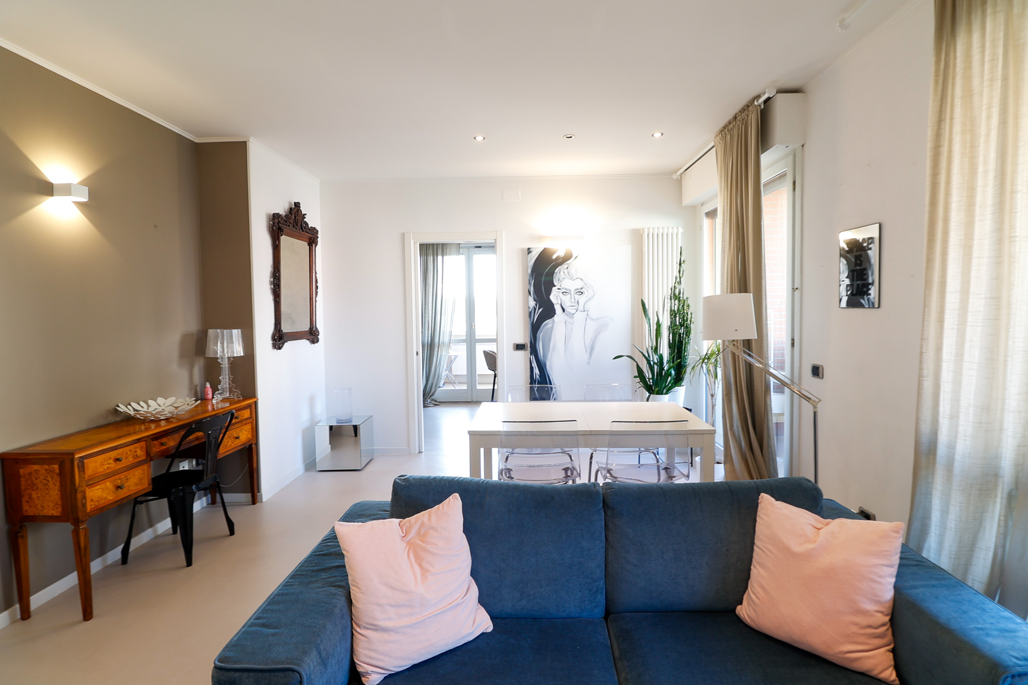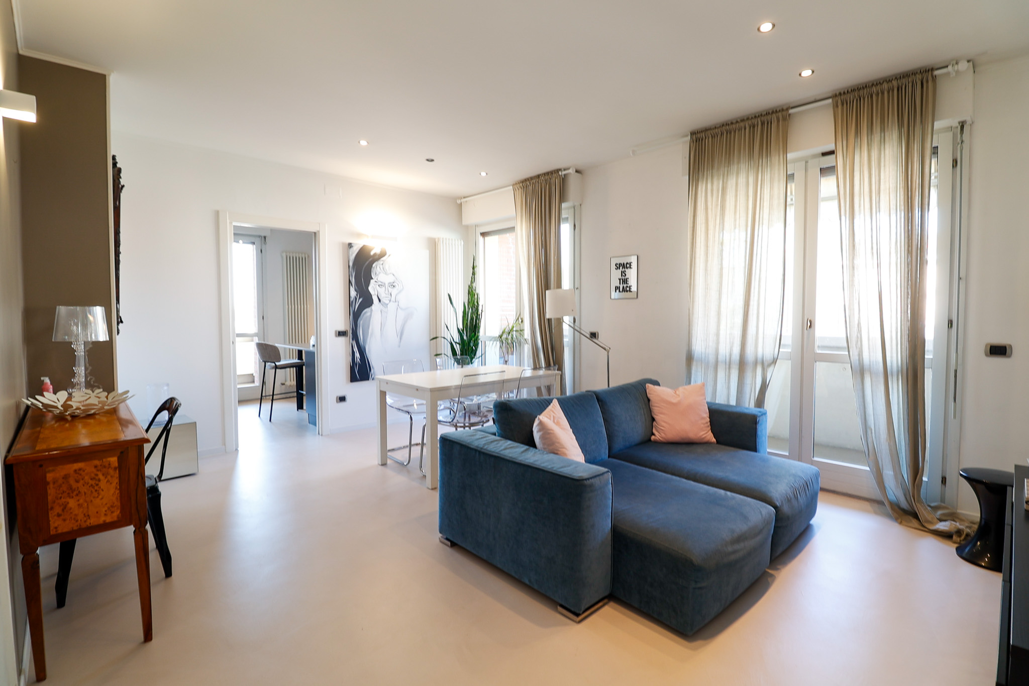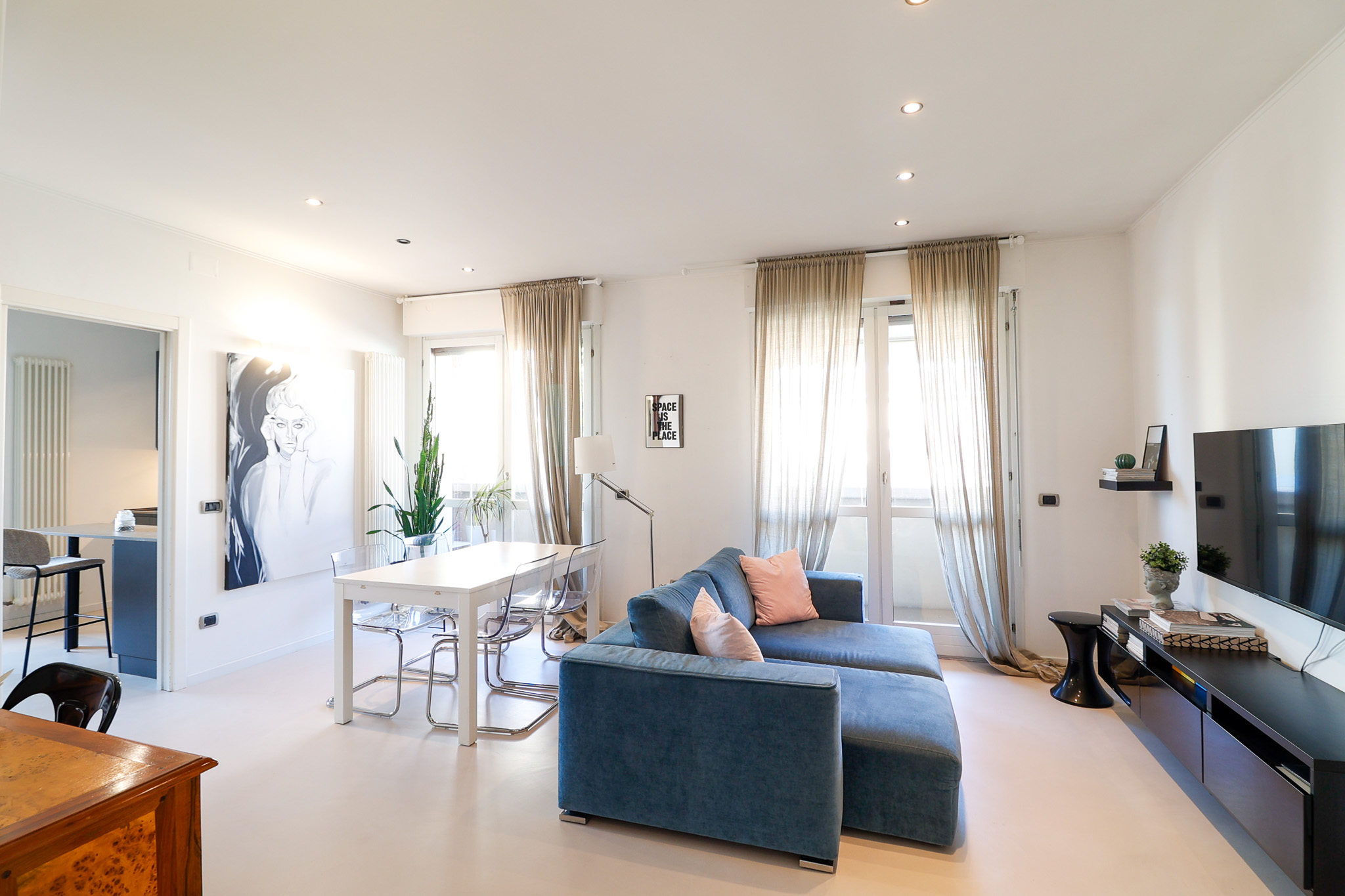 L’ingresso si apre su una zona living ampia e ariosa, caratterizzata dal pavimento in resina e da porte finestre che collegano direttamente al balcone, creando continuità tra interno ed esterno e una piacevole sensazione di spazio.