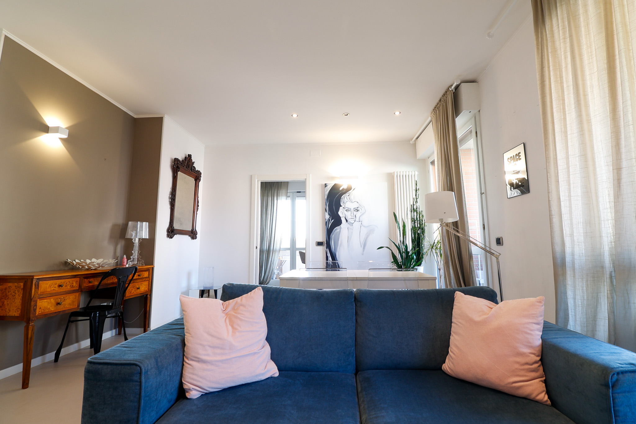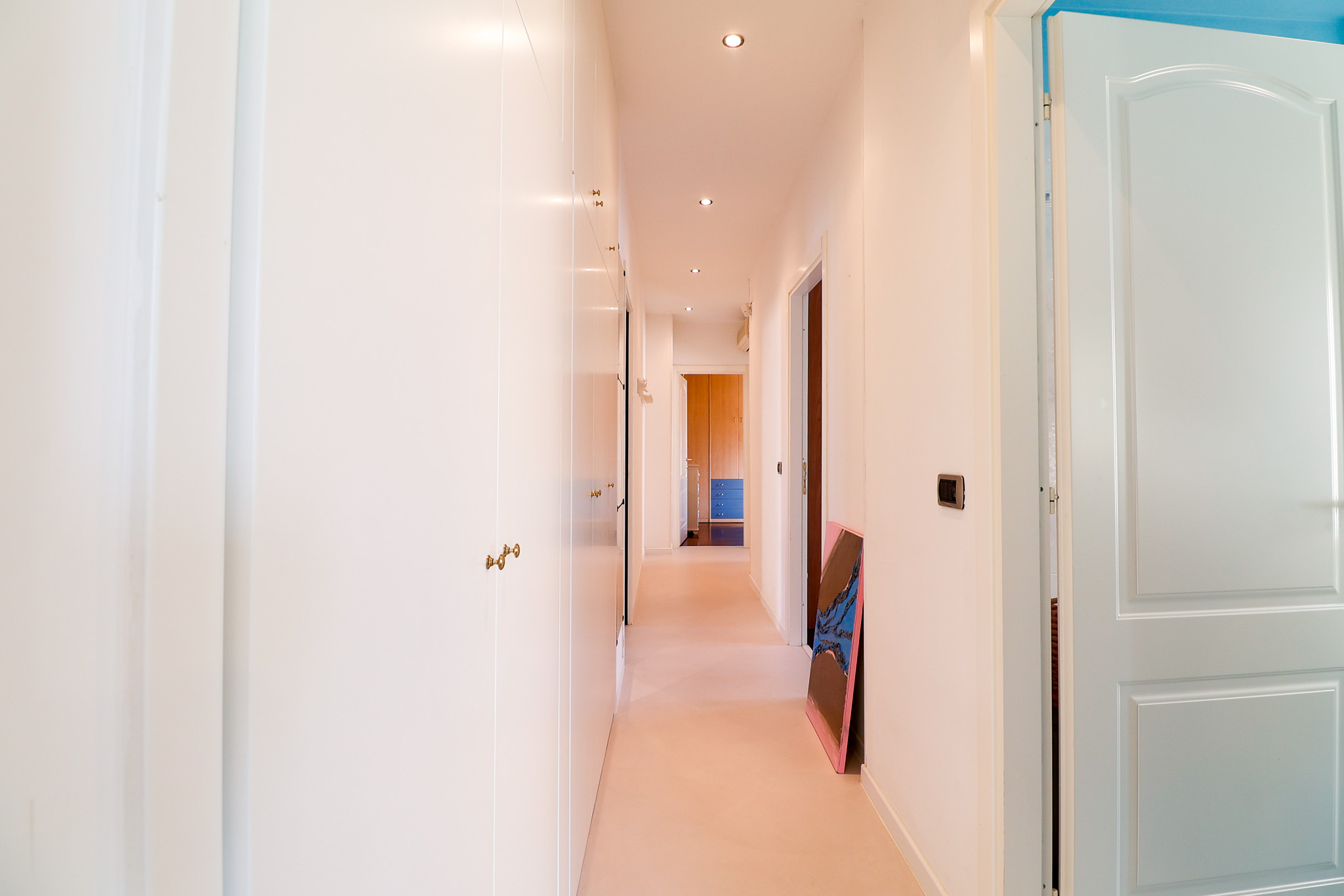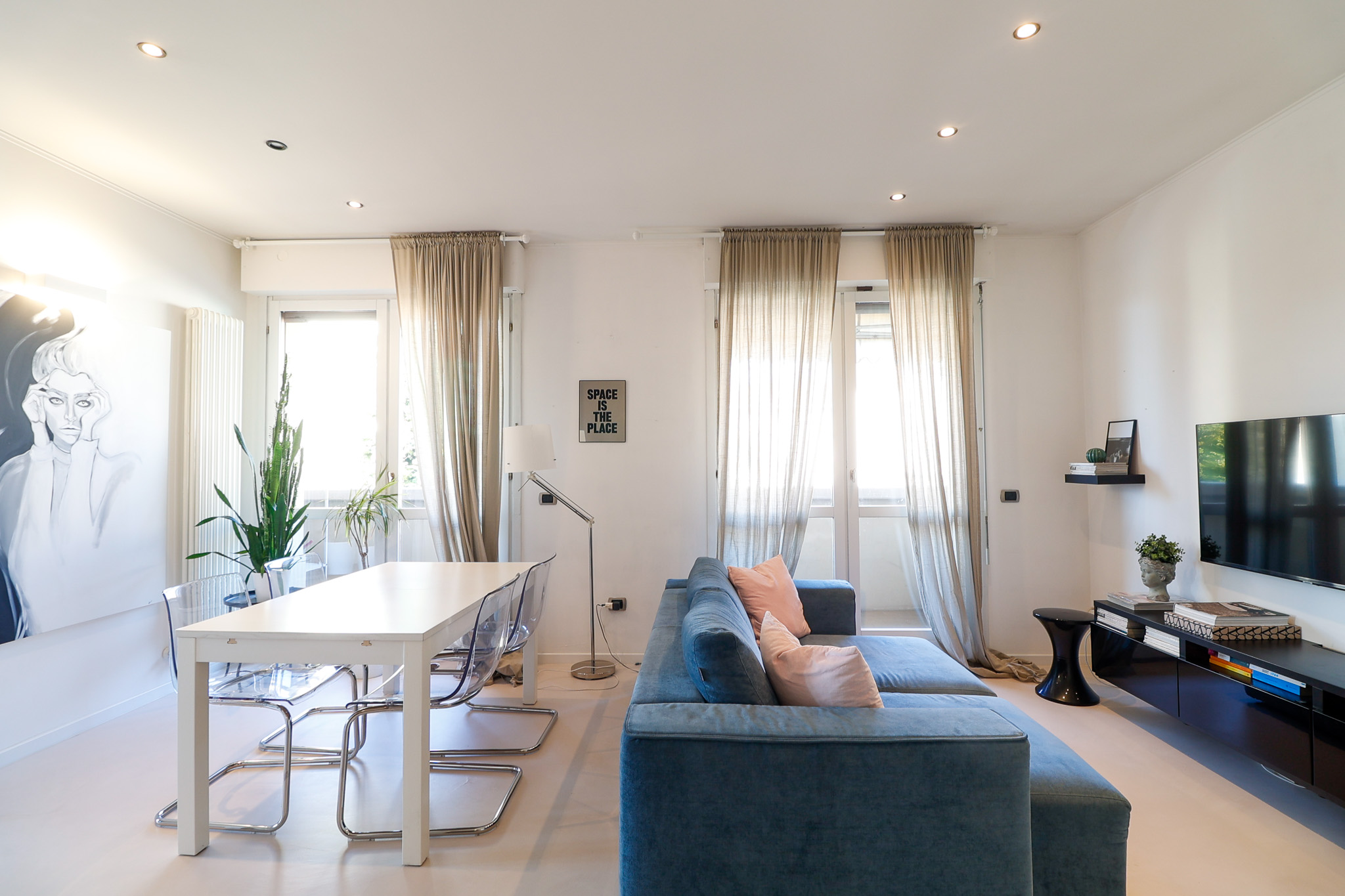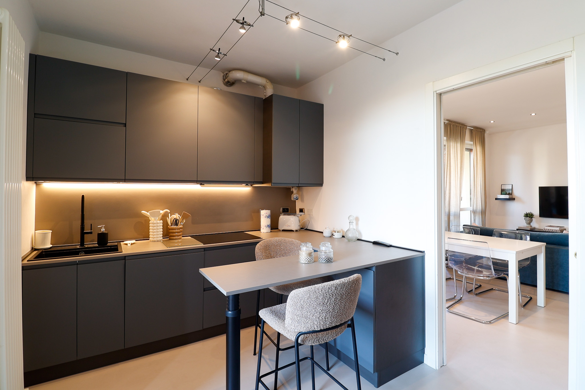 L’ingresso si apre su una zona living ampia e ariosa, caratterizzata dal pavimento in resina e da porte finestre che collegano direttamente al balcone, creando continuità tra interno ed esterno e una piacevole sensazione di spazio.