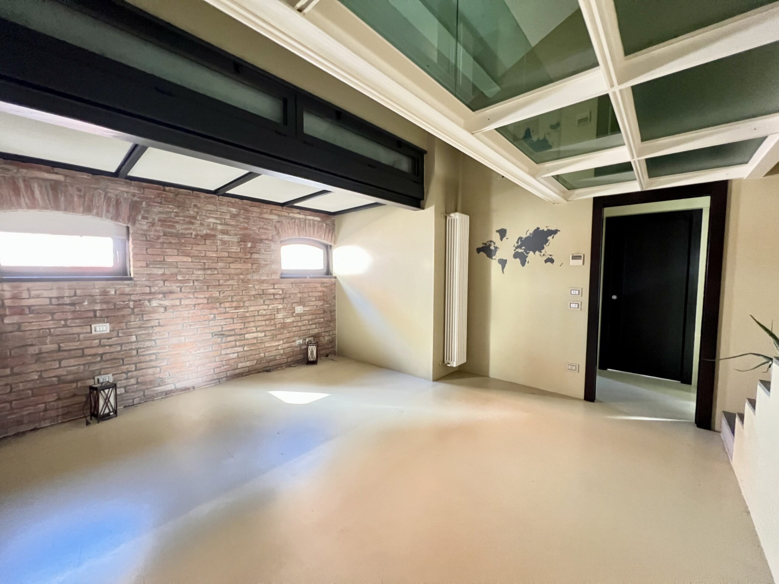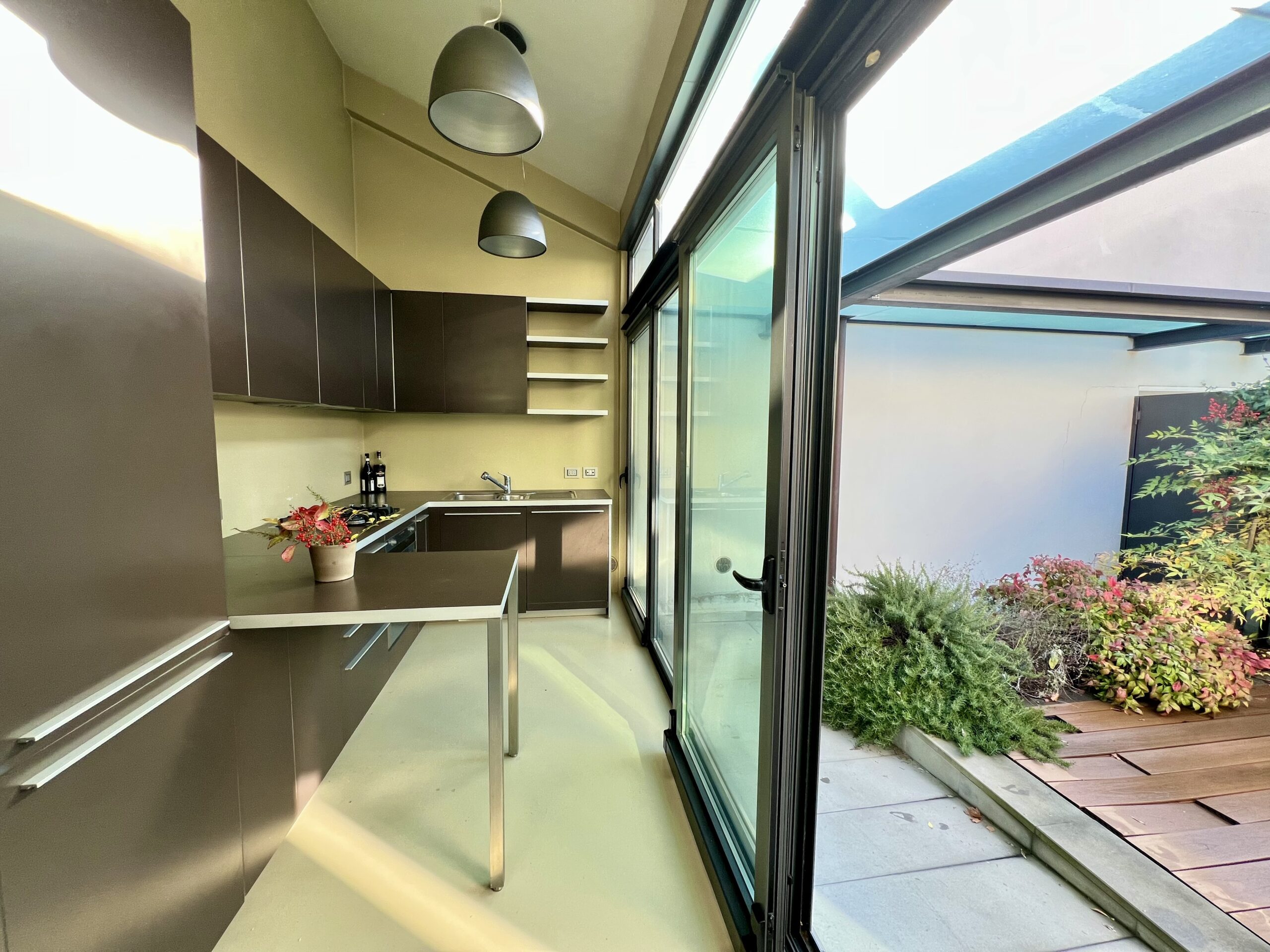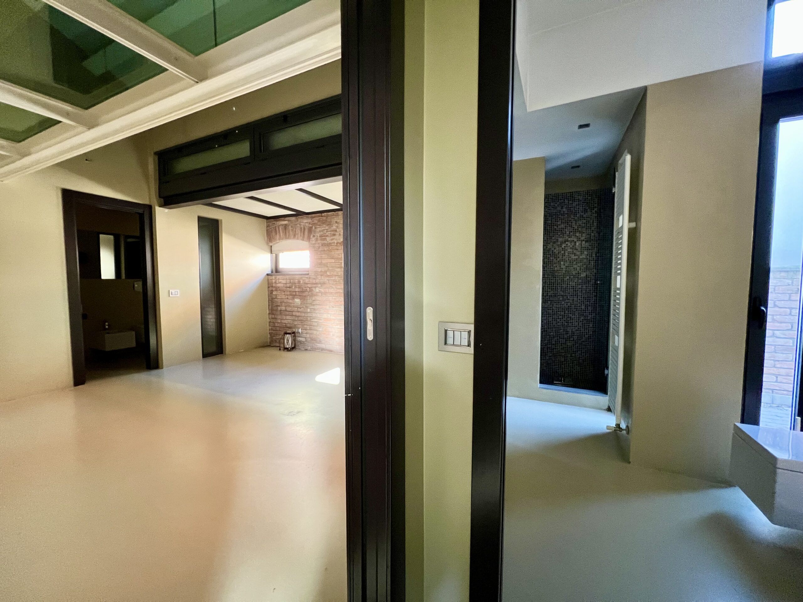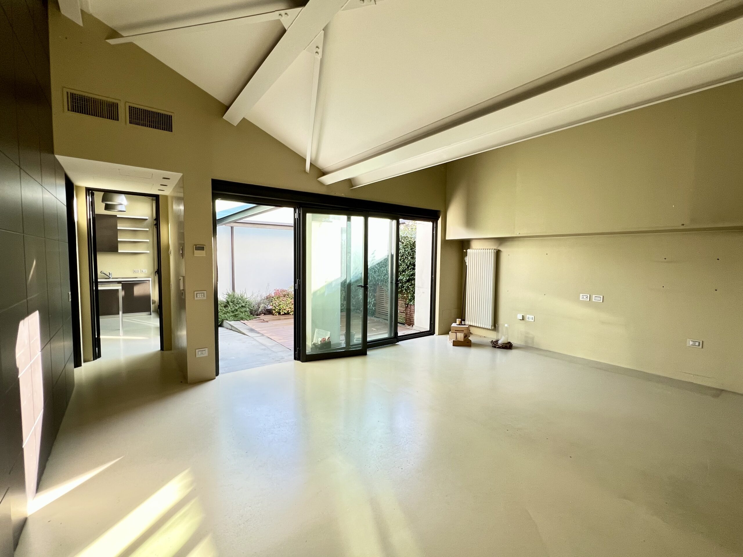 L’abitazione colpisce per la grande luminosità degli spazi, l’elevato livello delle finiture e la quiete dell’ambiente circostante. L’ingresso indipendente conduce direttamente a un ampio patio esterno, perfetto per momenti di relax o per piacevoli occasioni conviviali. Le ampie vetrate si affacciano sulla zona living, generosa e contemporanea, valorizzata da elementi metallici a vista che richiamano l’anima originaria dell’edificio. La cucina, separata e semi-abitabile, coniuga praticità ed estetica.